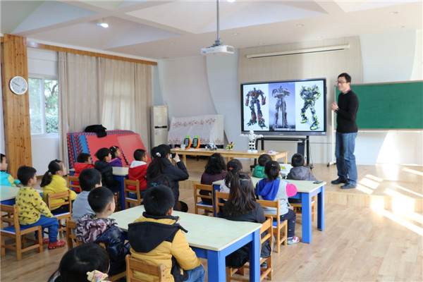 活动开始,家长首先问孩子们,平时看过那些机器人?叫什么名字?在哪部电影里看到的?它有什么本领?并用白板展示了《变形金刚》里的擎天柱,大黄蜂;《机器人总动员》里的瓦力和伊娃;《超能陆战队》里的大白和《星球大战》里的BB-8,孩子们的兴趣被激起。