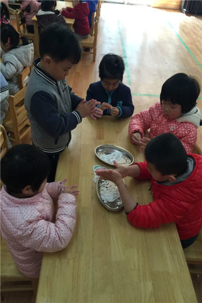 教师现场和糯米面,使幼儿对元宵的材料和制作方法有直观地了解。幼儿搓元宵的兴致很高,洗干净小手就迫不及待地开始动手操作了。老师除了巡视指导,还提醒幼儿注意卫生,搓元宵时不说话;身体靠着桌子,尽量不把米粉、元宵撒地上,避免浪费等等。幼儿看到搓好的元宵都欢呼起来。下午点心时,幼儿品尝到自己搓的元宵,都高兴地说:“元宵真好吃”。“这是我们搓的元宵!”