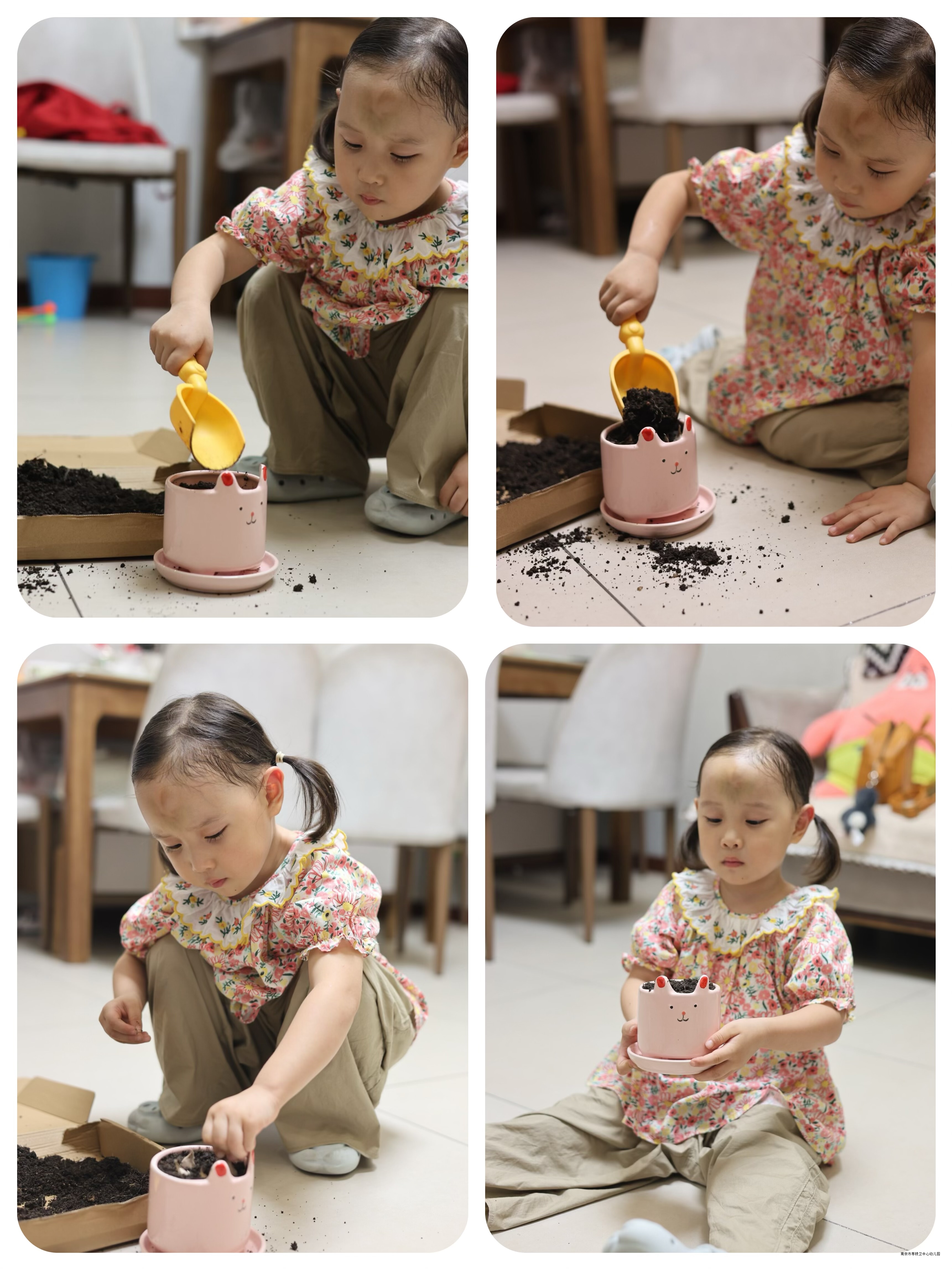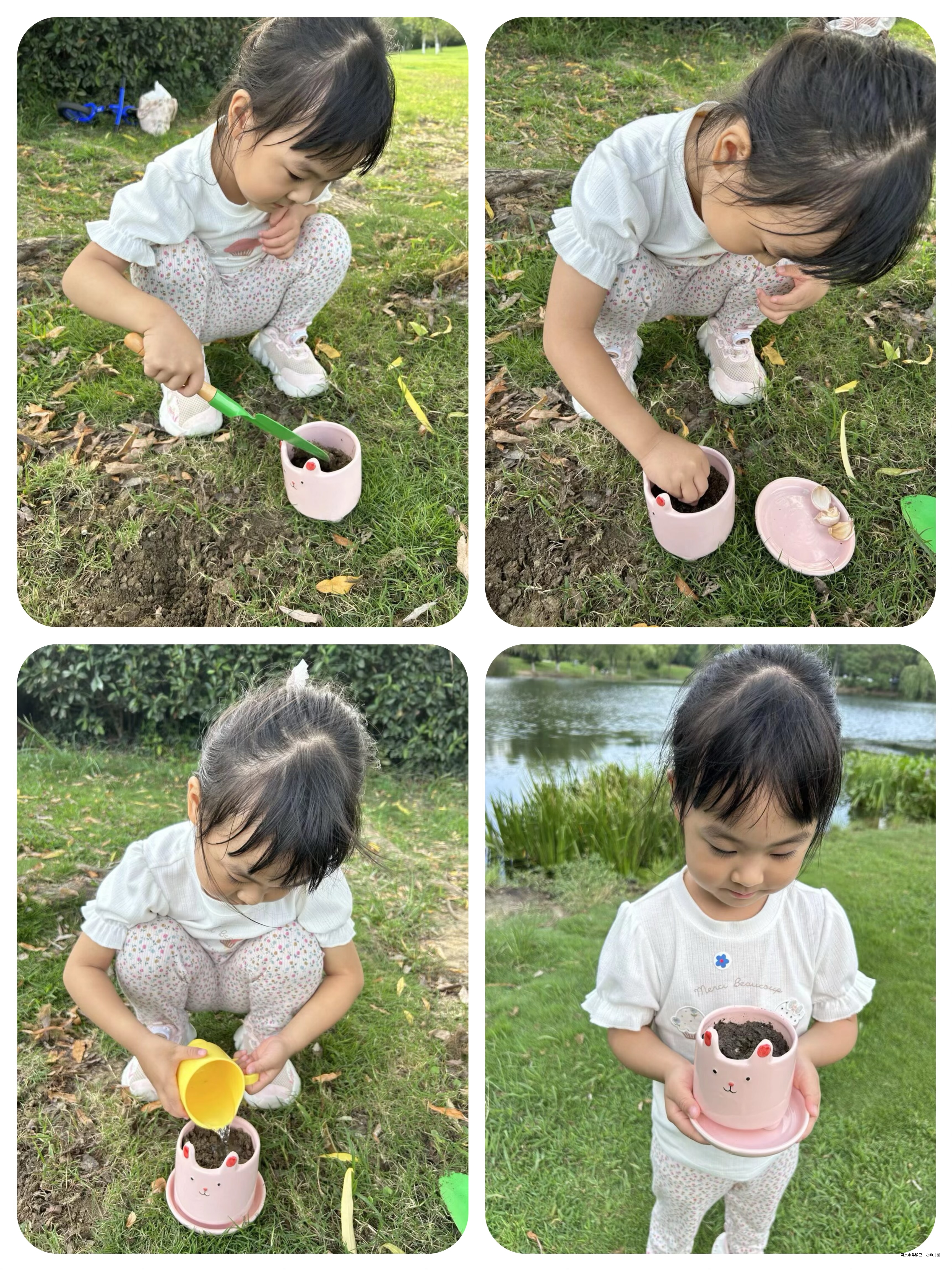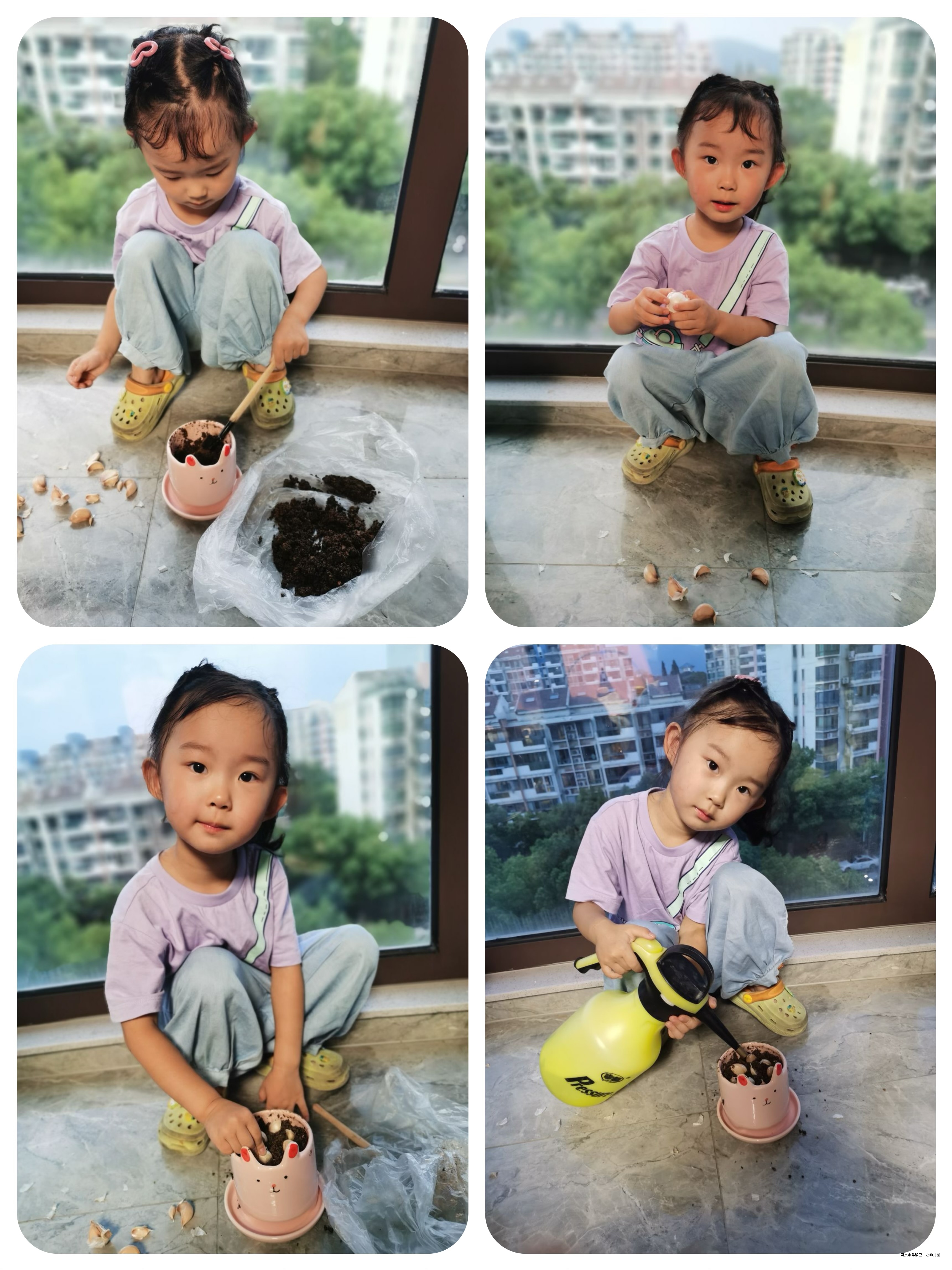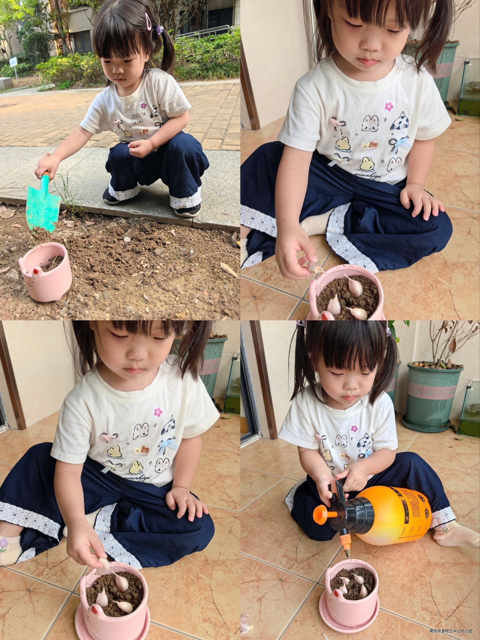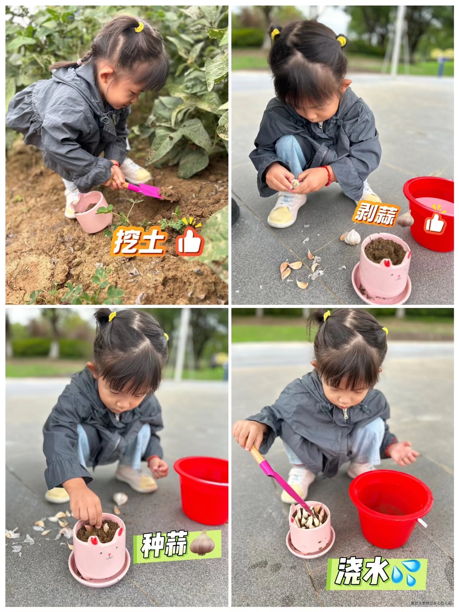 我要种大蒜宝宝啦!我先挖土,将土挖到小花盆里,接着剥蒜,然后再把蒜瓣种到小花盆里,最后还要给它浇浇水,我的大蒜宝宝就种好啦!