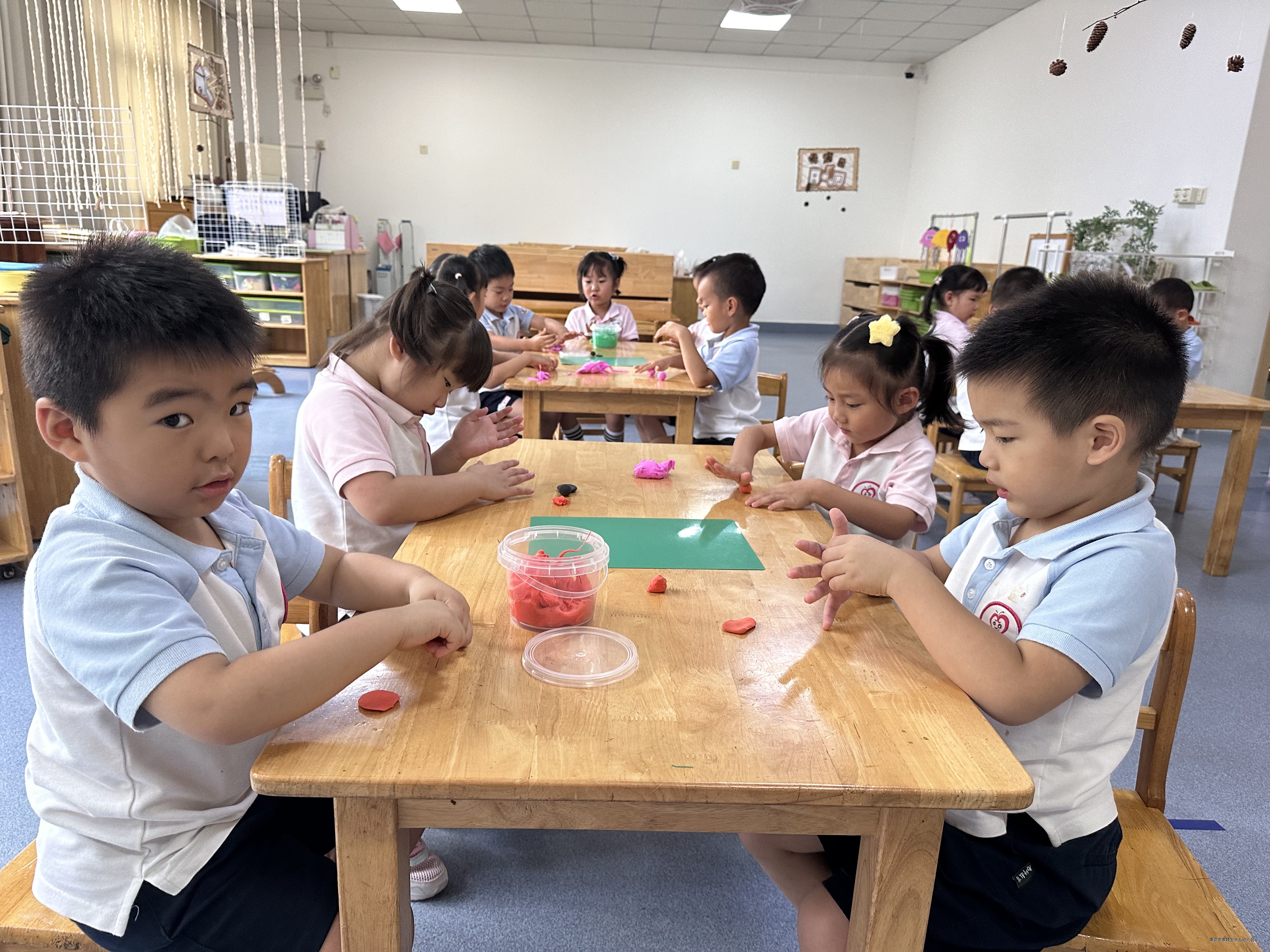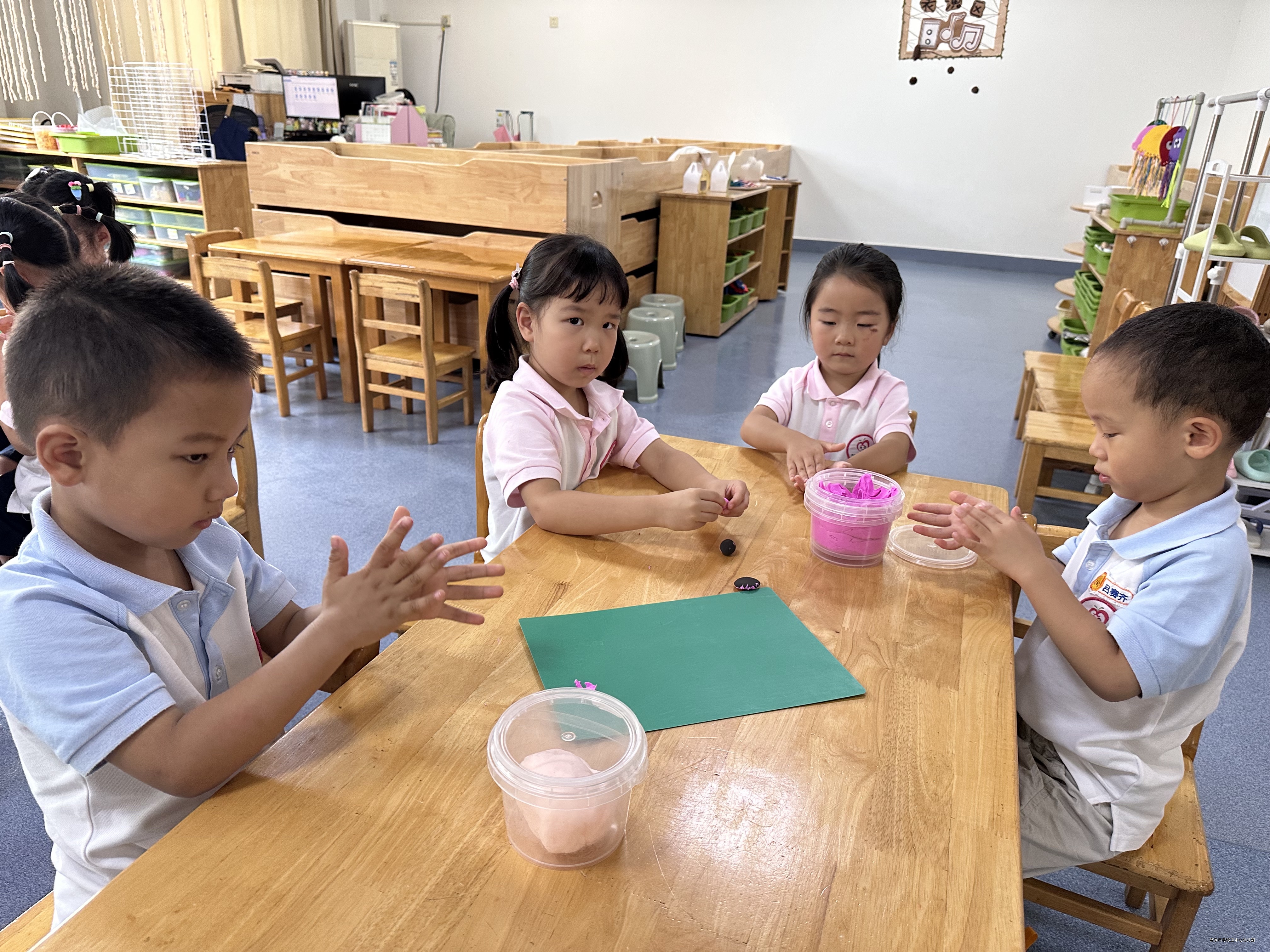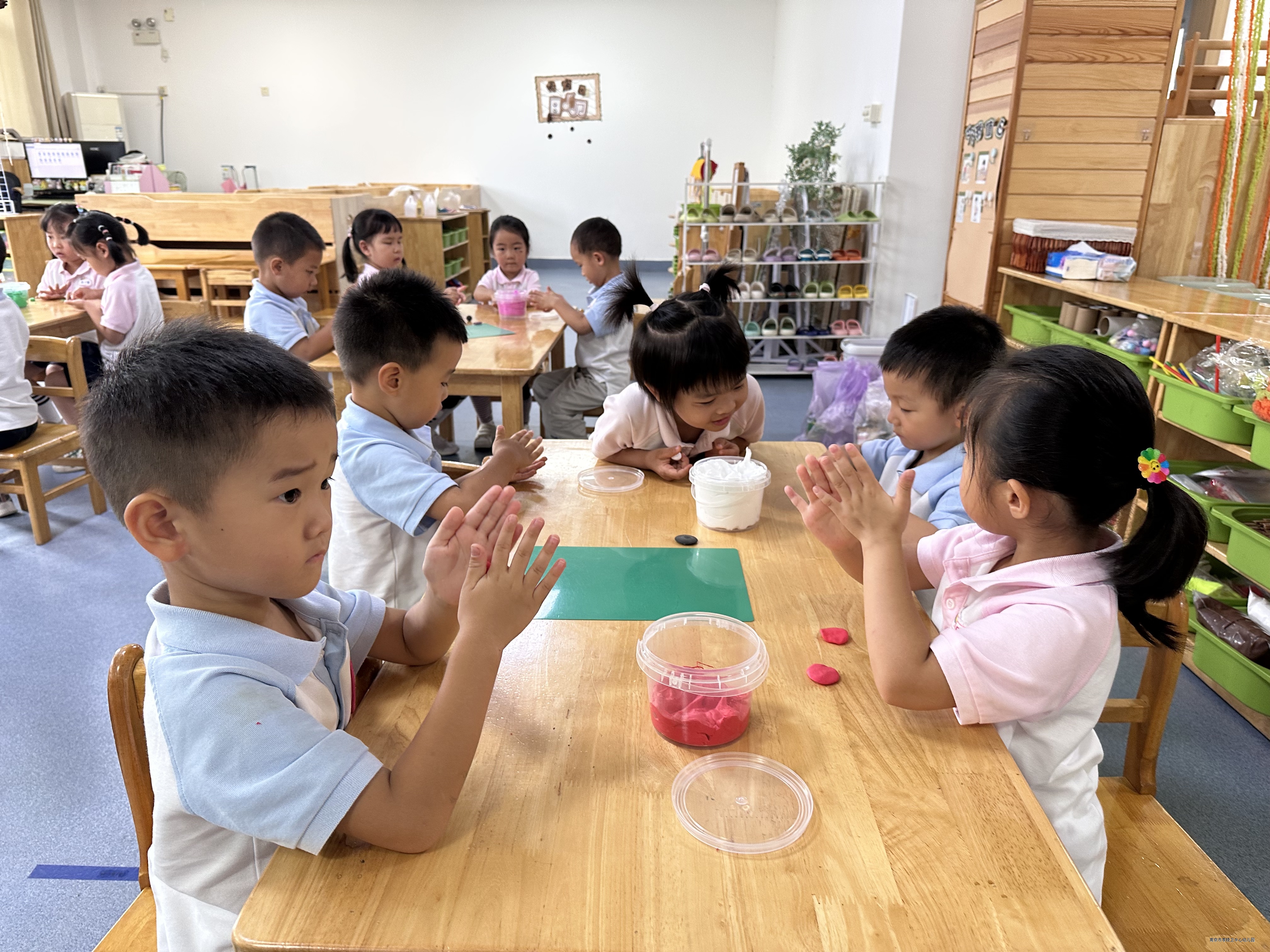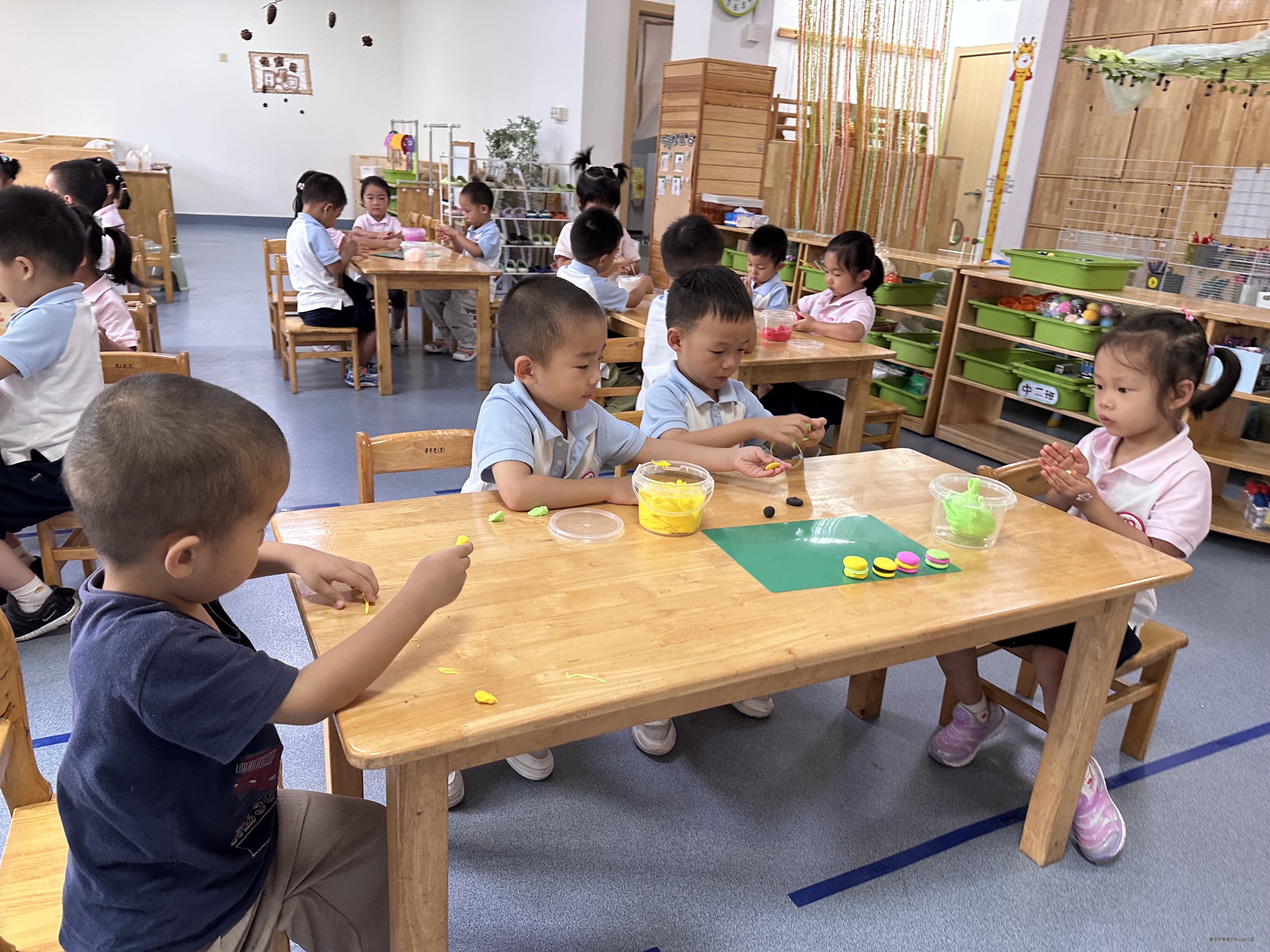 一团一团的黏土,像小山堆的彩虹棉花糖。我们揪一块黏土揉圆,压扁时它还 “回弹”,像在和我玩游戏。这样做三个,然后将它们叠起来,放到泥工板上就可以啦!还有的小朋友,将两种颜色混合起来,捏了个双色马卡龙,中间夹上 “奶油” 黏土,还粘了颗小糖粒。它们要一起住进我们的甜品店!