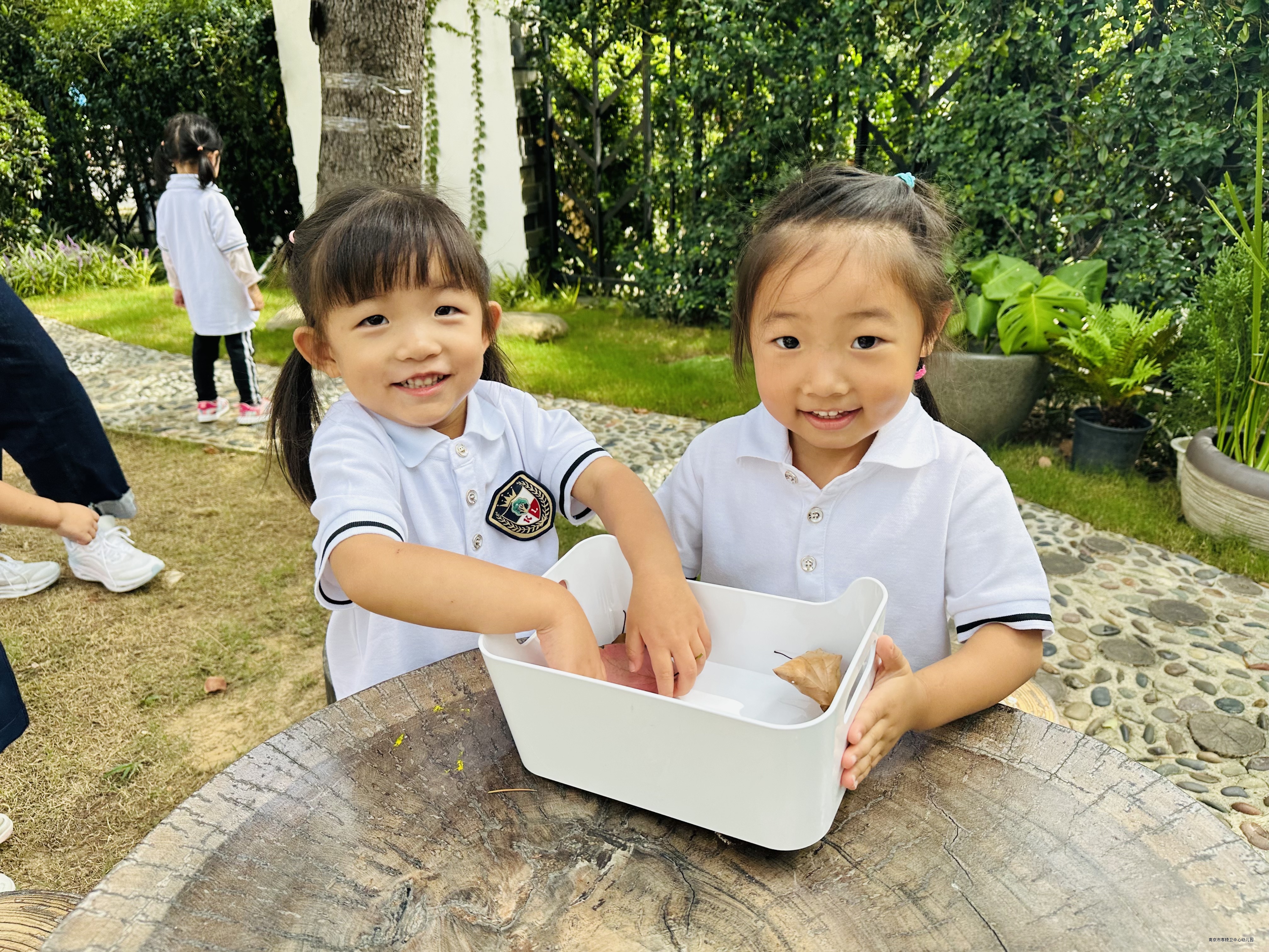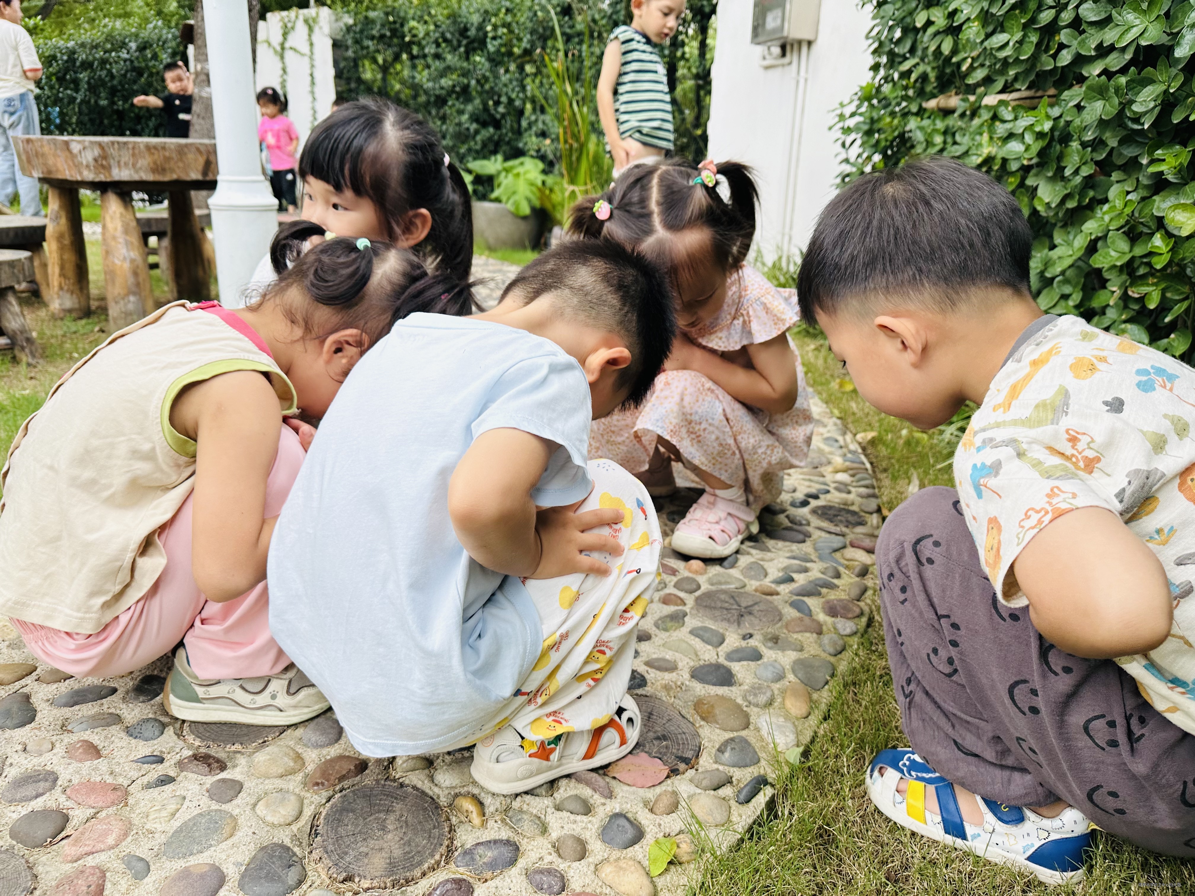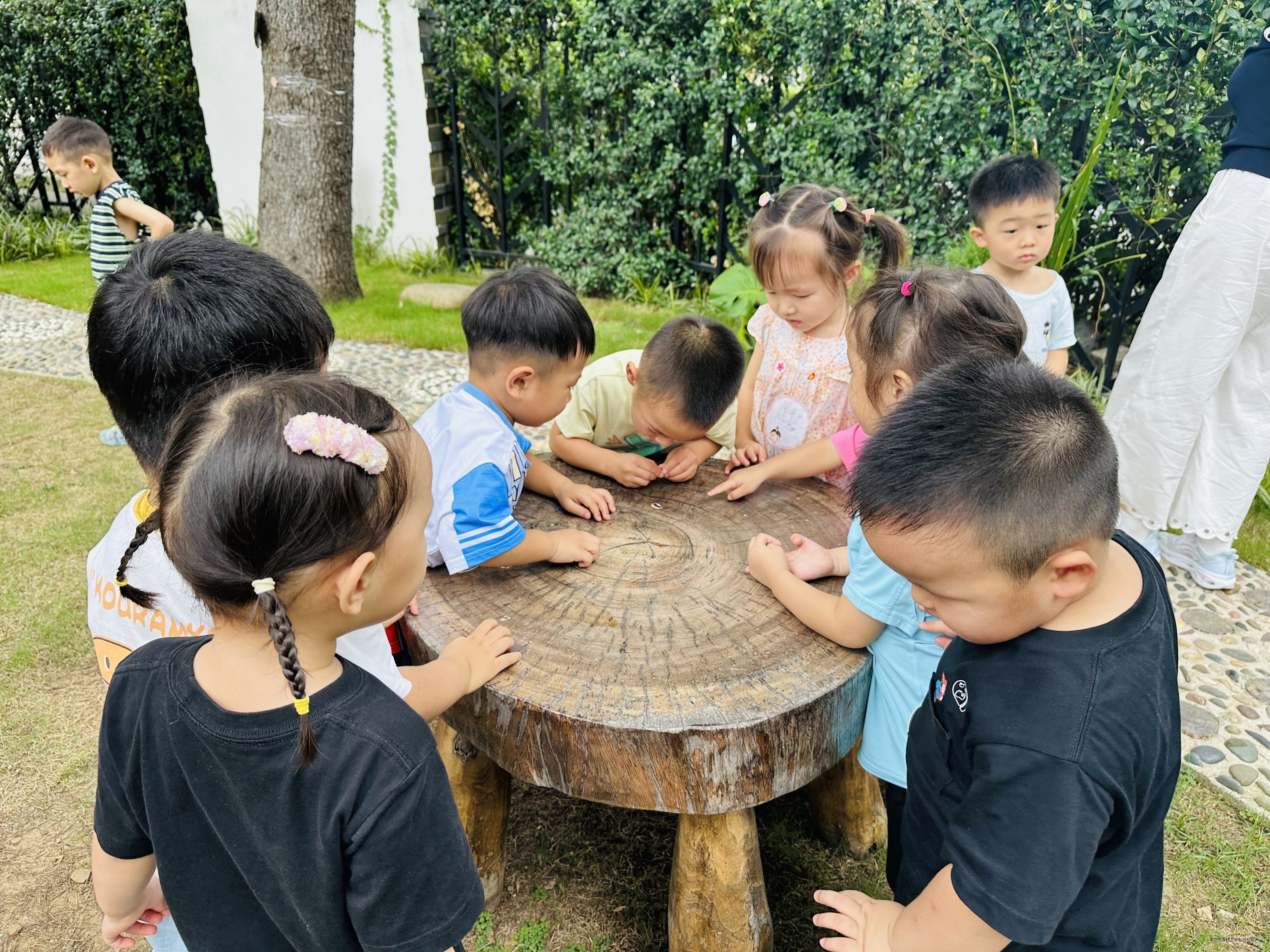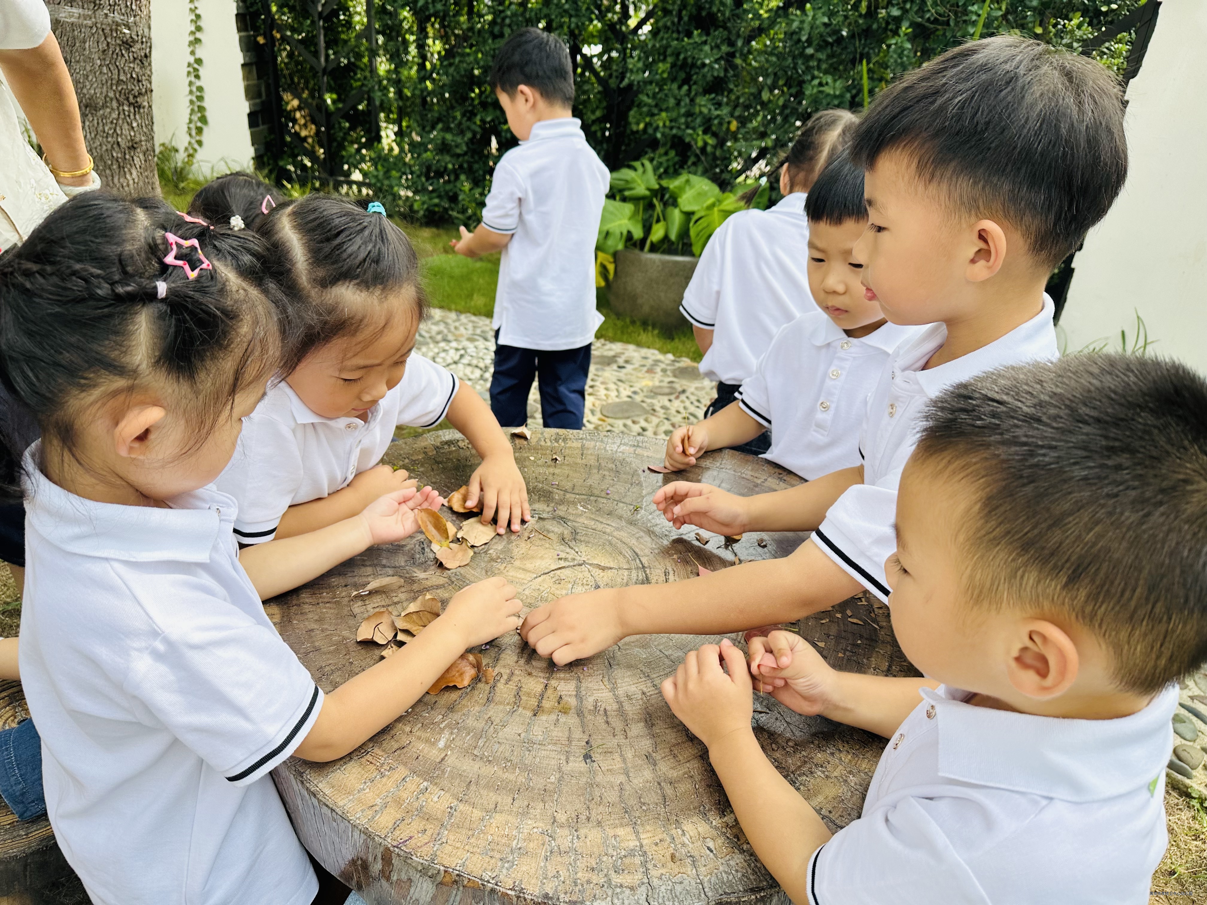 我们在幼儿园户外的三棵树乐园的石子路上发现了小蚂蚁、西瓜虫,树上的叶子掉下来了,有的树叶是绿色的,有的是红色的,有的已经枯掉了,我们还发现了鸟的粑粑掉在了桌子上。