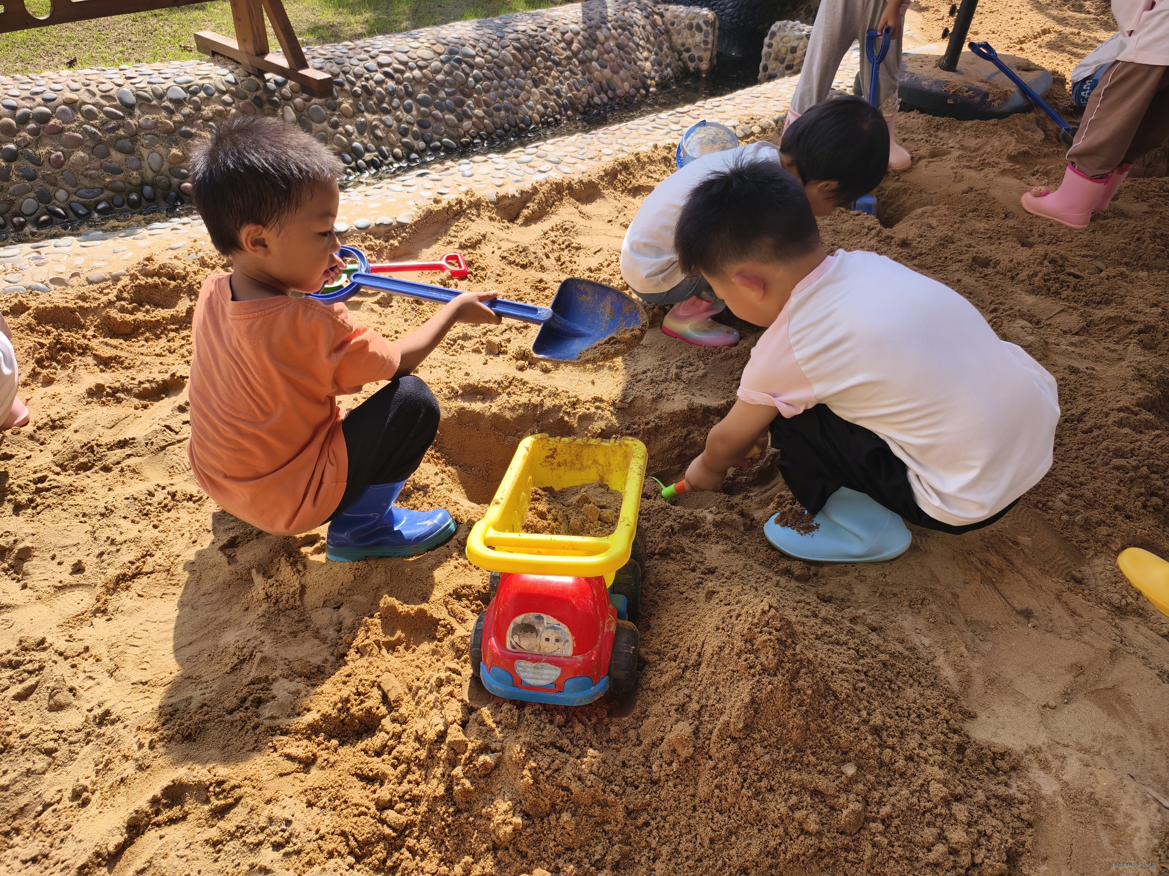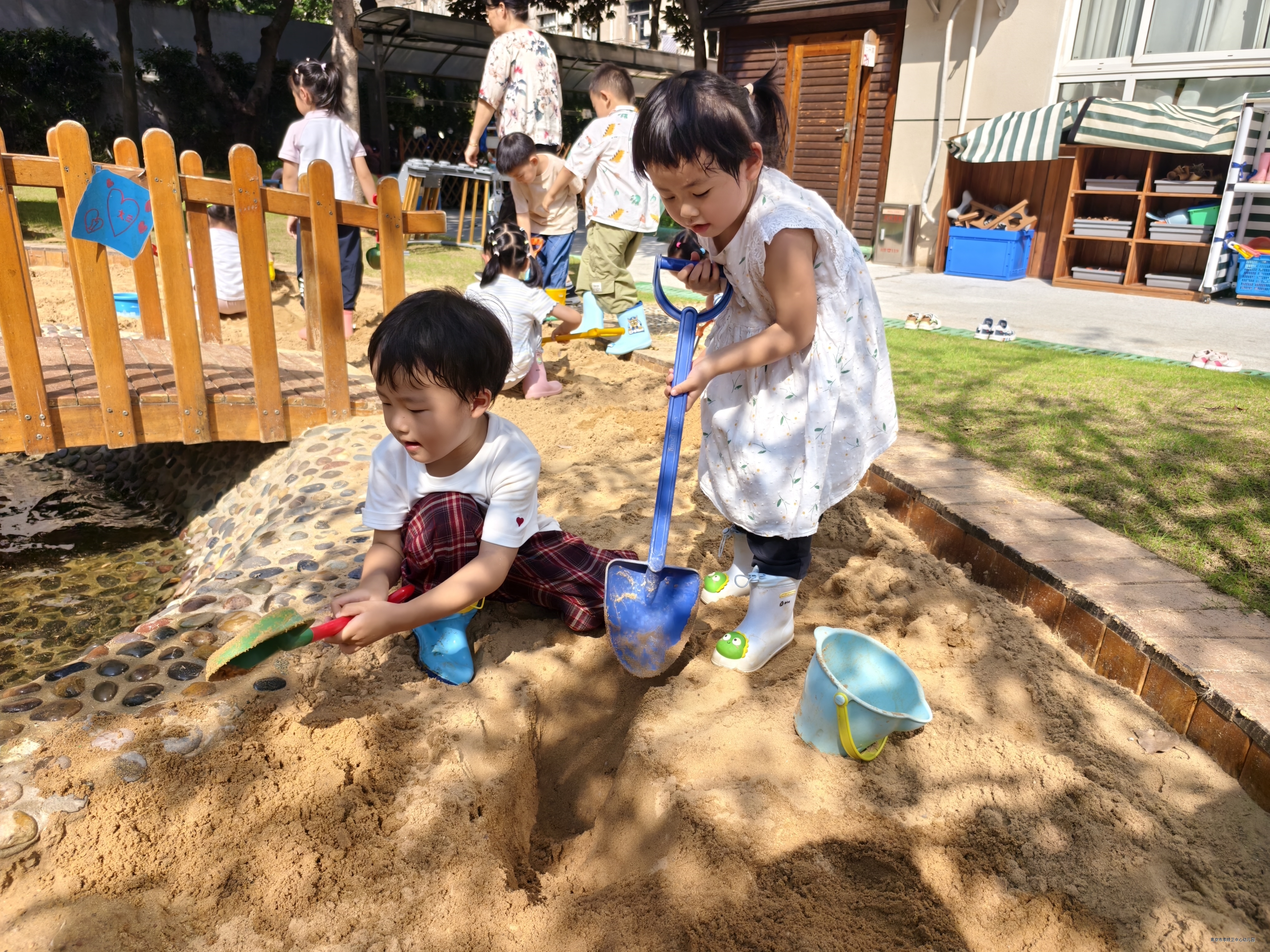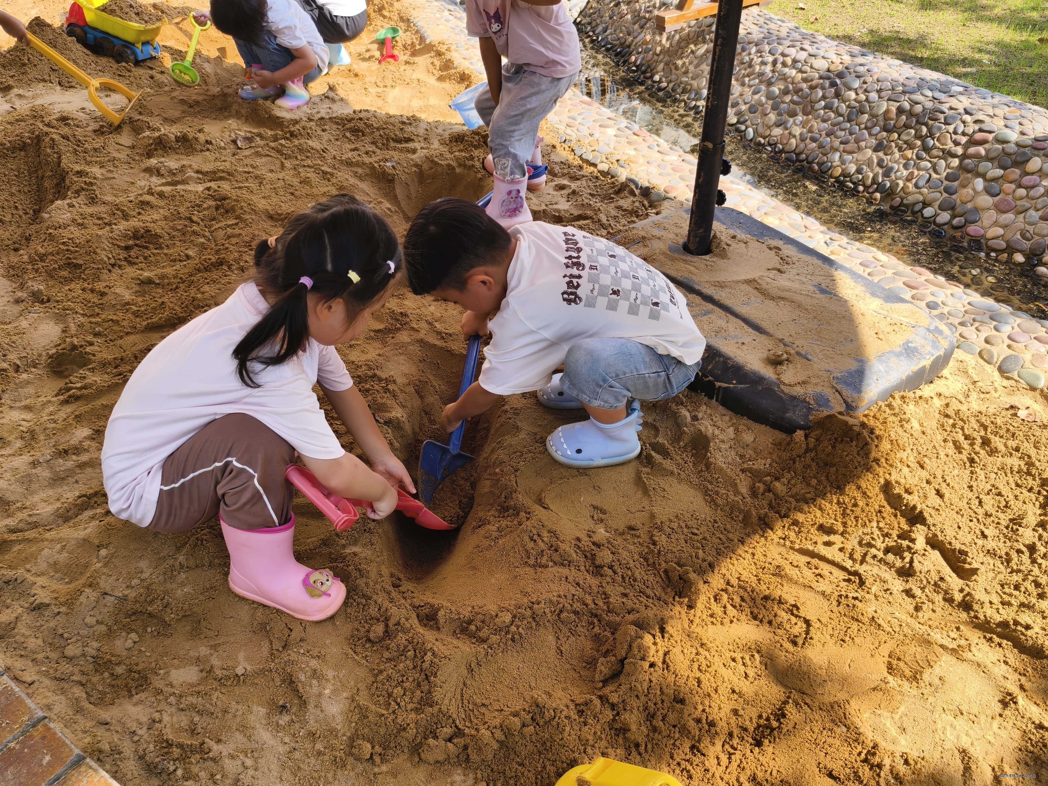 我们在沙池里探索多样玩法,挖造型各异的水坑、脱多样的模型,真的非常有趣哦!