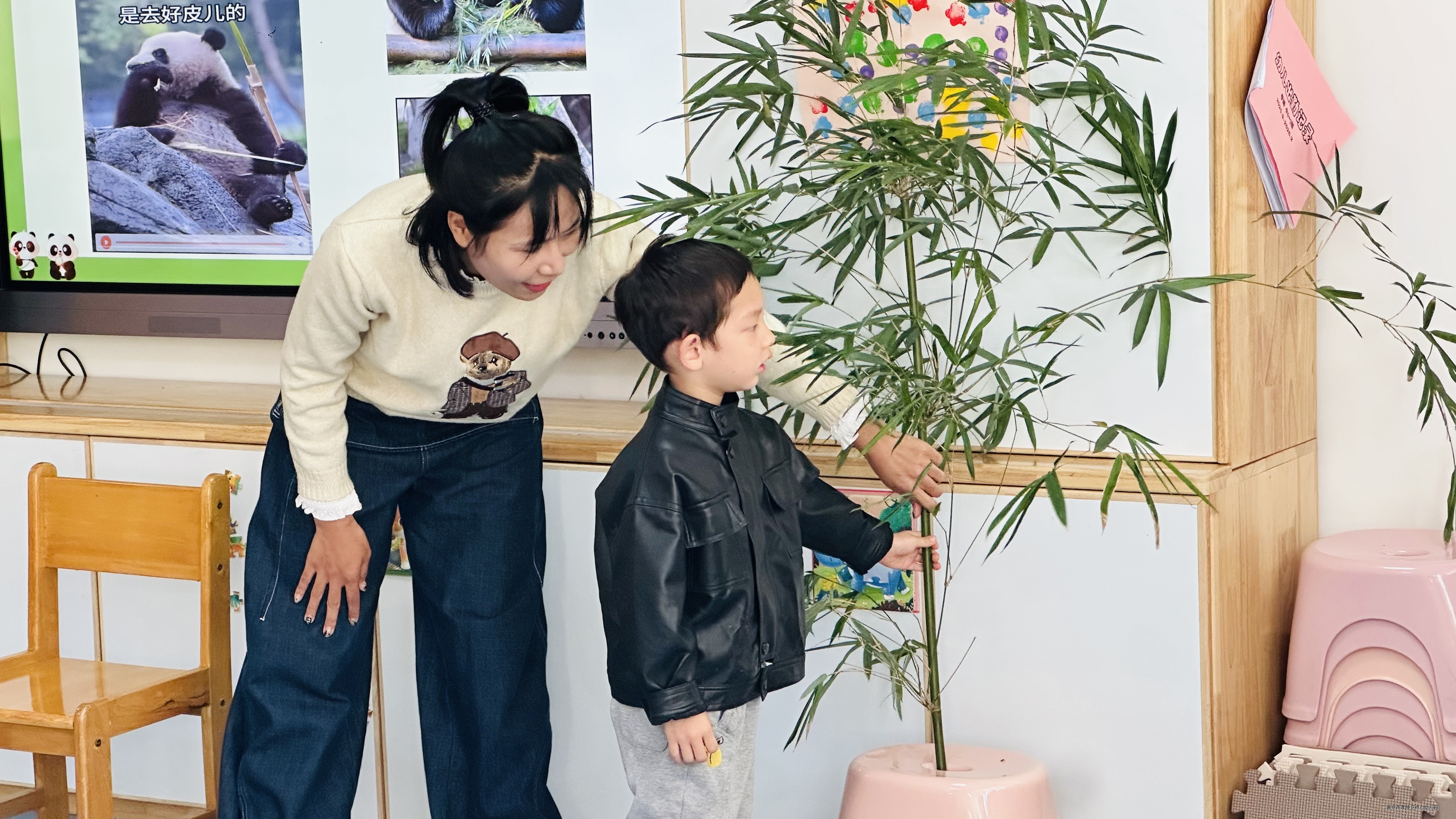 张晋显妈妈带了大熊猫最喜欢吃的食物——竹子,我们摸了摸,闻了闻,原来大熊猫喜欢吃竹子。我们看到了大熊猫小时候的样子,跟长大时候可太不一样啦。我们还听了大熊猫的声音,“咩咩”,