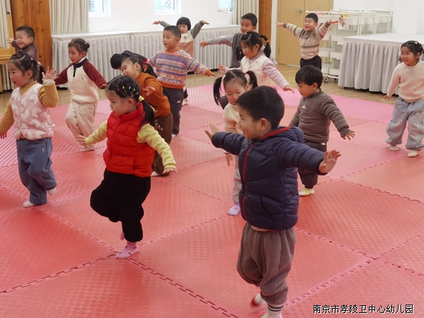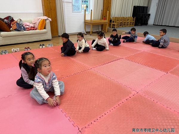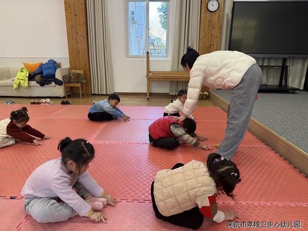 我们模仿小蝴蝶、小吊车、小螃蟹,做拉伸、平衡等练习,动作越来越灵活协调啦!