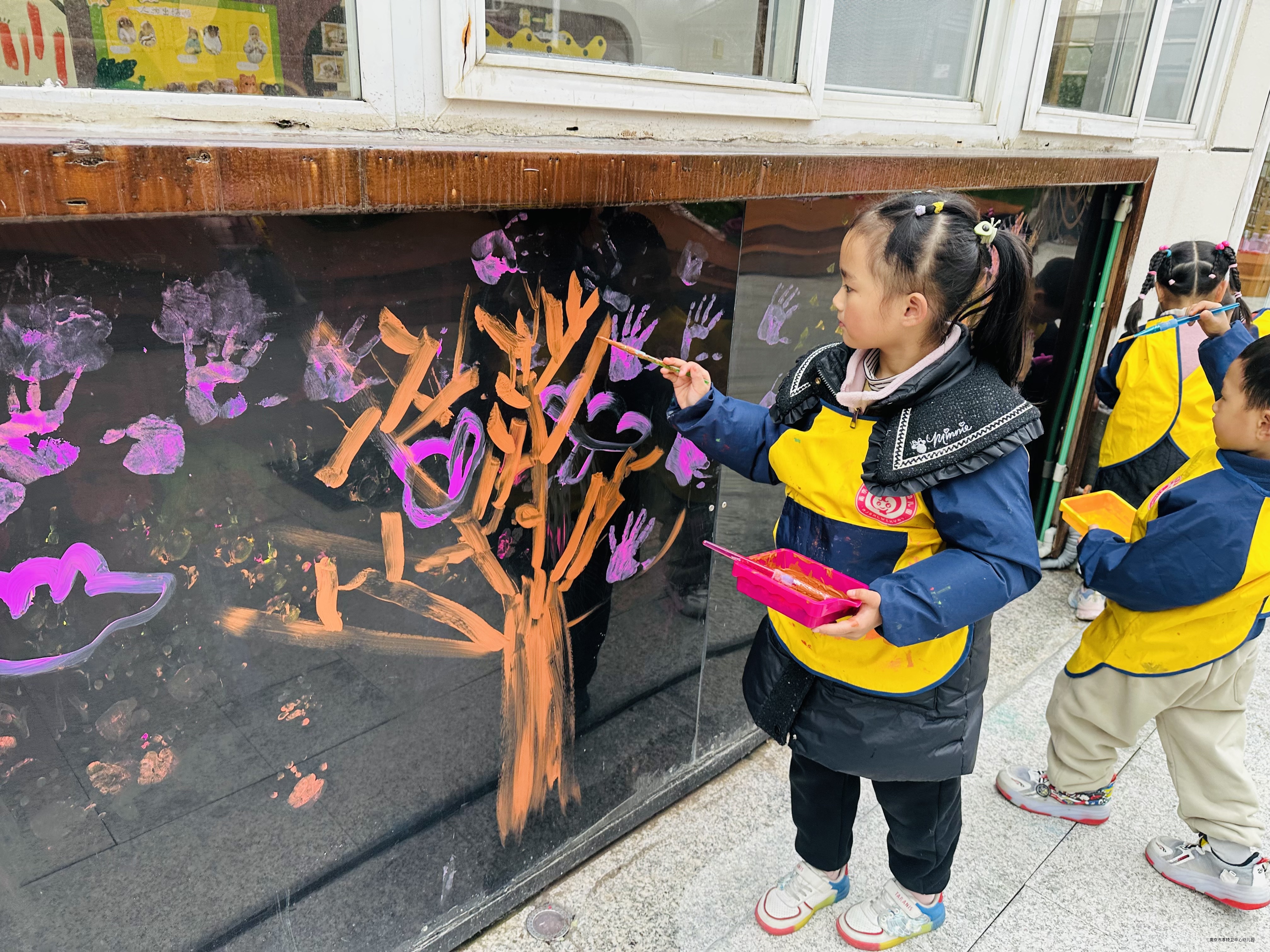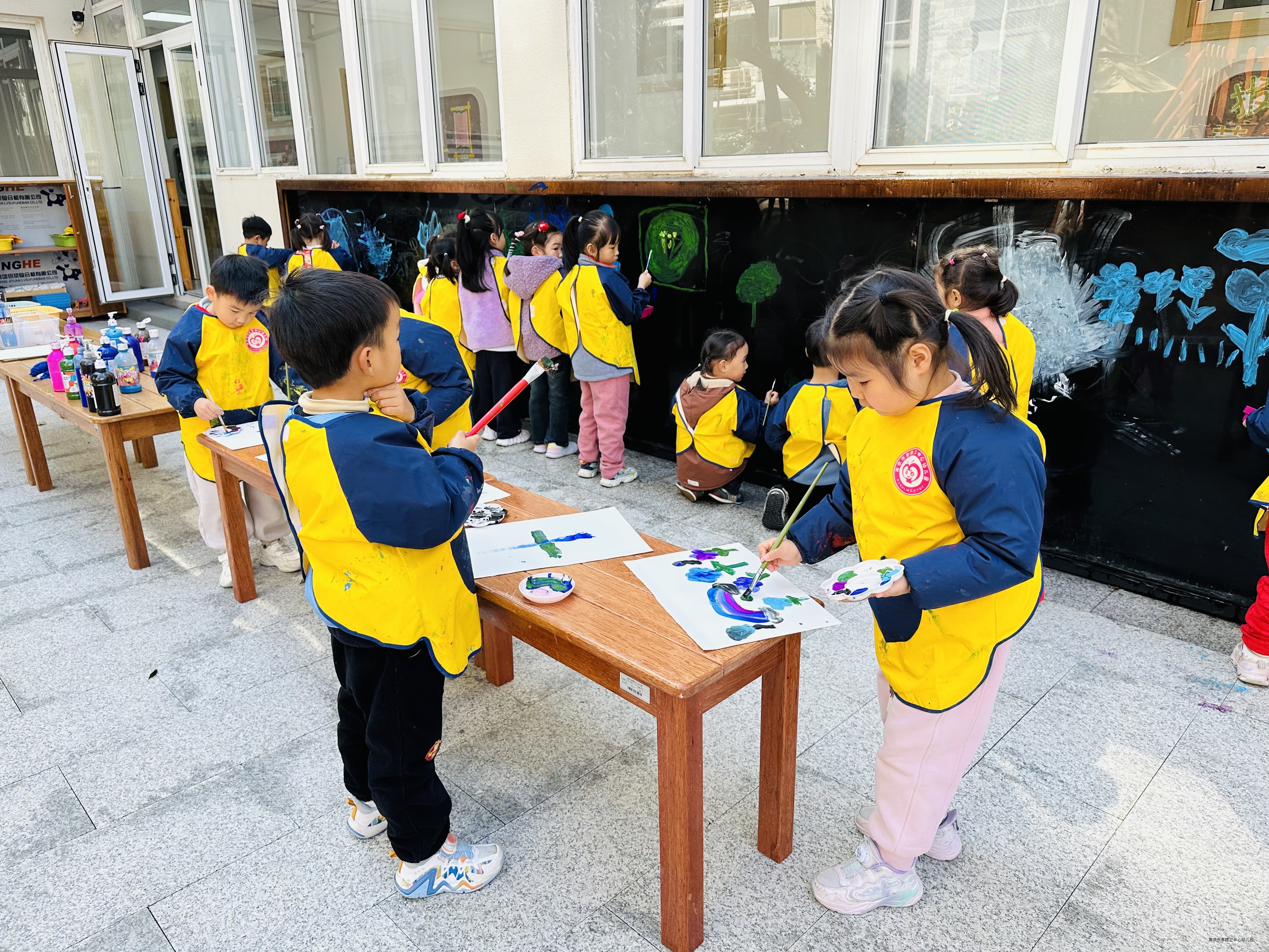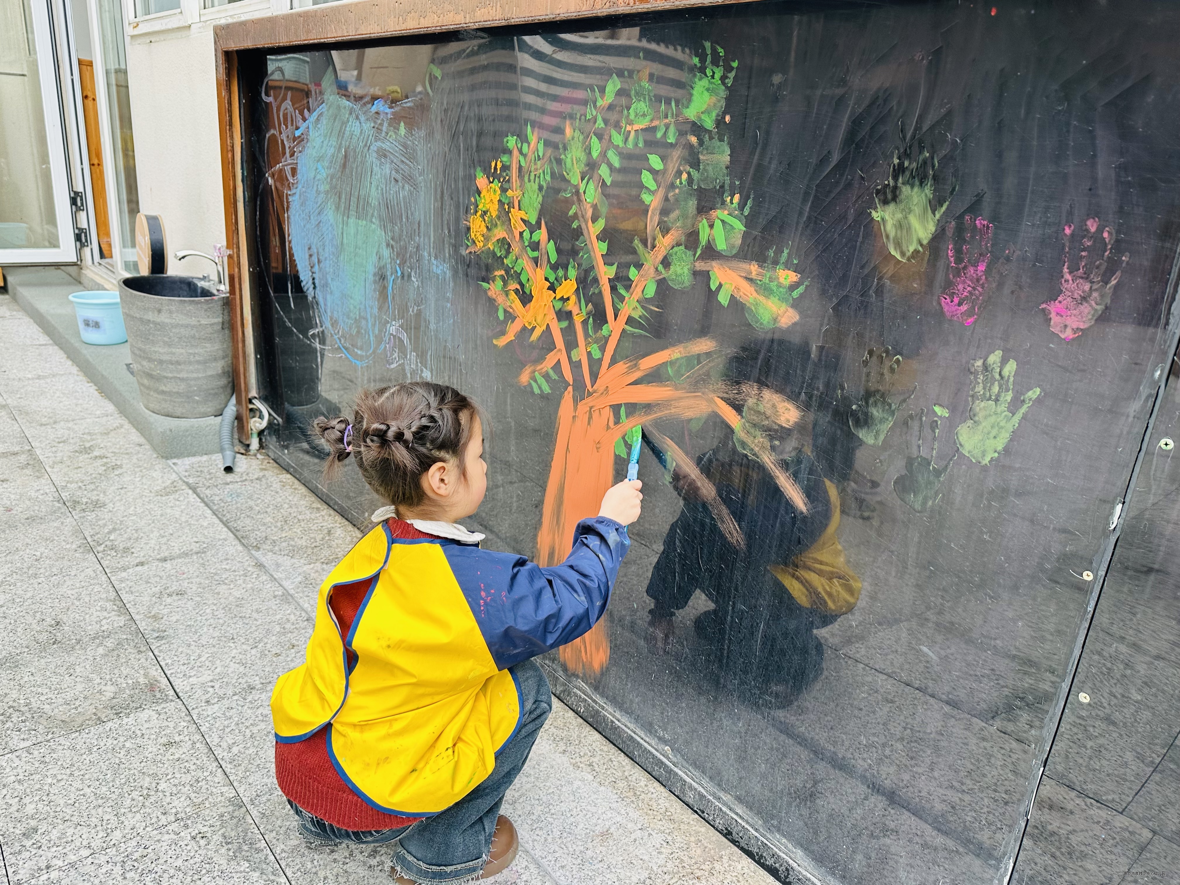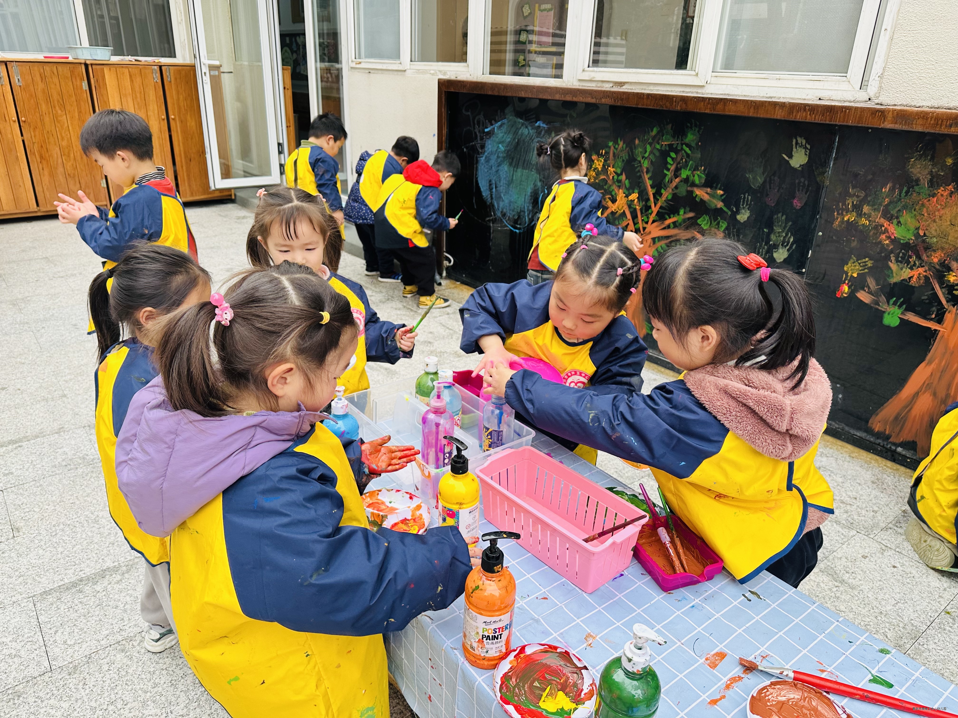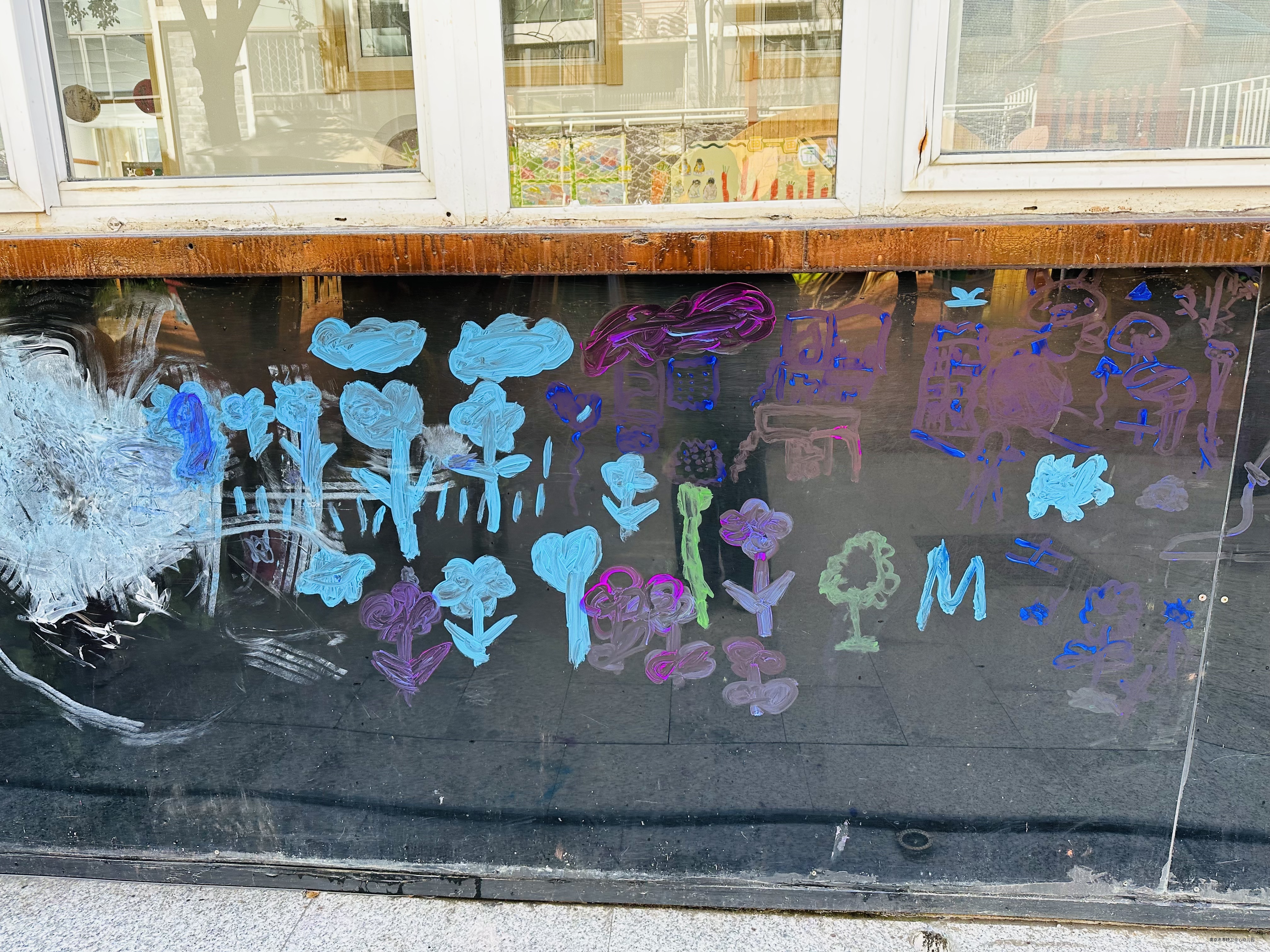 春天来了,树冒出了新的嫩叶,花儿都开了,真是太漂亮了!快看我们在彩虹墙上的创作吧!